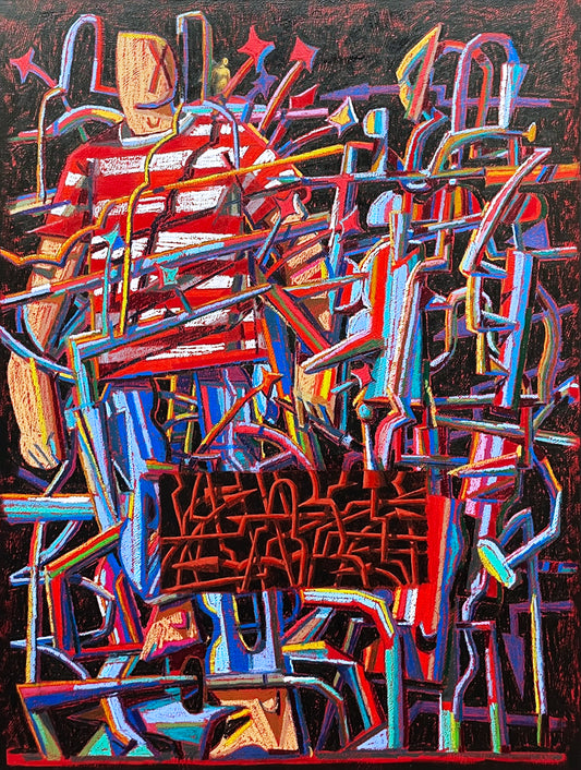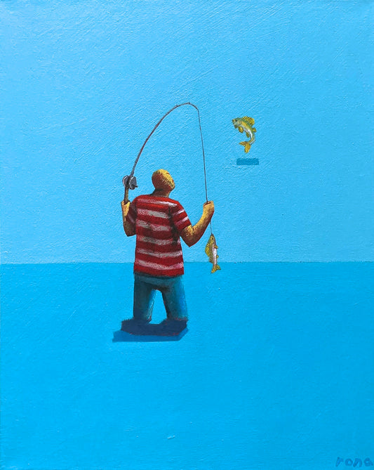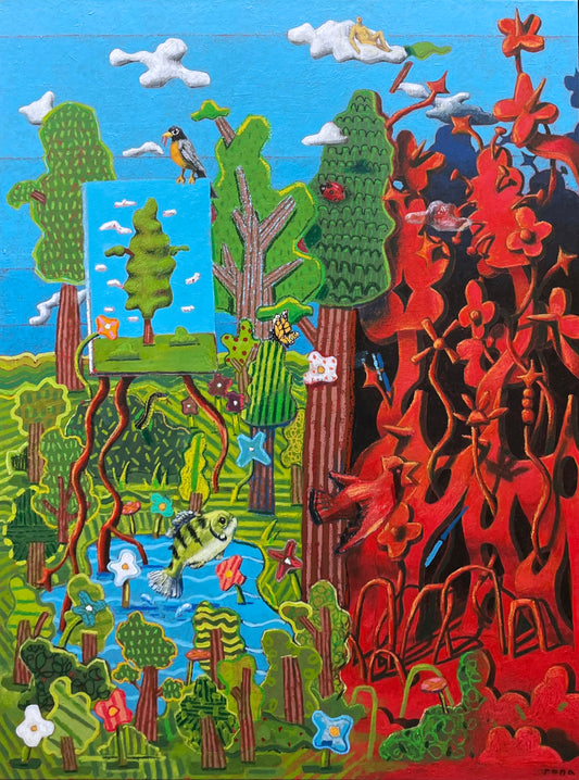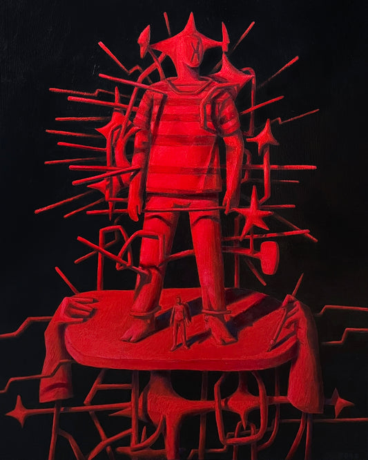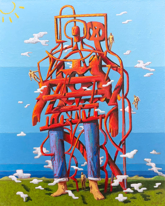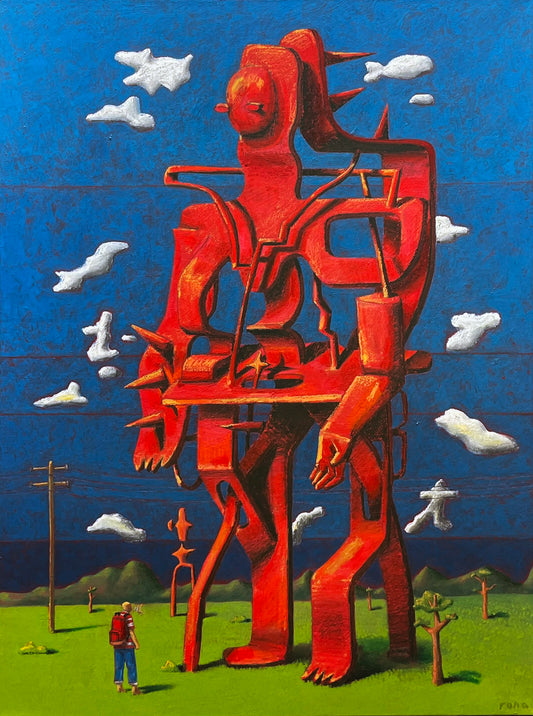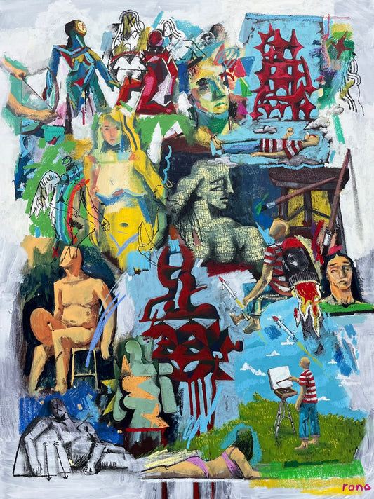 In Daniel Rona's latest body of work, he uses a character in a red and white striped shirt as the vehicle for his ideas, navigating an adventure that unfolds on a subconscious level within the vast, open world of his imagination. Daniel sees creativity as an endless landscape - free, unpredictable, and filled with possibilities - where ideas emerge unexpectedly and take shape through exploration.These paintings visualize Daniel's artistic process, capturing the push and pull of creativity, the tension between structure and impulse, calm and chaos. The character of the artist moves through this “realm,” encountering the good, bad and bizarre ideas that form in the depths of Daniel's mind. Through these works, he explores what it feels like to create - and invites viewers into an ever-shifting world of imagination.