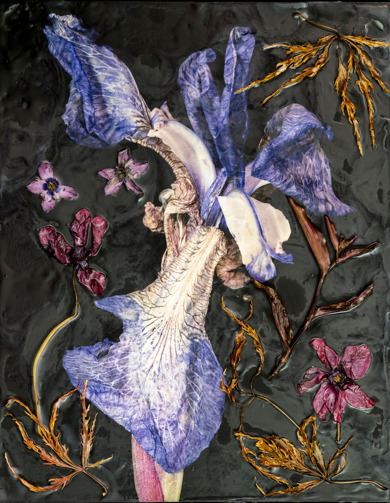 inkjet print, encaustic wax, dry plant material